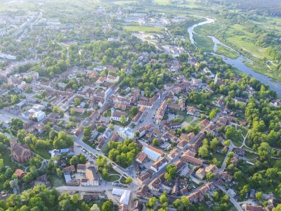 3. Gaisa skats uz Kuldīgas pilsētu ar Ventas upi, veco ķieģeļu tiltu un plašo Ventas rumbu. Abpus upei redzamas ēkas ar sarkanīgiem jumtiem, ko ieskauj zaļi lauki un koki.