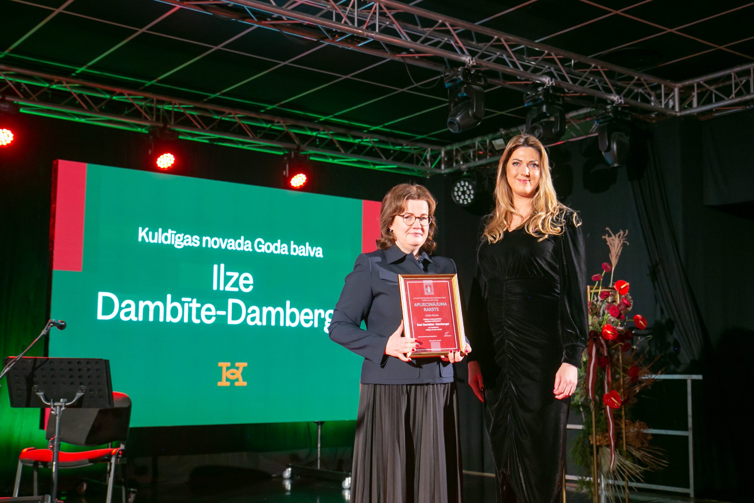 Kuldīgas novada pašvaldības ilggadējā izpilddirektore Ilze Dambīte-Damberga Goda balvu saņem par ieguldījumu Kuldīgas novada attīstībā. I. Dambīte – Damberga pašvaldībā strādājusi kopš 2007. gada – sākumā par sabiedrisko attiecību speciāliste, bet kopš 2009. gada līdz pat 2023. gada izskaņai pildījusi pašvaldības izpilddirektores pienākumus. Šobrīd viņa strādā par Viedās administrācijas un reģionālās attīstības ministrijas parlamentāro sekretāri. Visu ko Ilze dara, viņa dara ar lielu atbildību, mīlestību un pacietību. Kuldīgā viņas redzes un rūpju lokā bija gan sociālā joma, gan sports, gan kultūra un izglītība. Darba lauks bija gana plašs un sarežģīts, neskatoties uz to, vienmēr tika meklēts labākais pozitīvais risinājums. Ar mīlestību sirdī pret Kuldīgu, Ilze iesaistījusies daudzu Kuldīgai nozīmīgu projektu īstenošanā, piedalījusies Mākslinieku rezidences un Adatu fabrikas izveidē, kas tagad kļuvusi par mājvietu Latvijas Mākslas akadēmijas starptautiskās maģistra studiju programmas “Pakalpojumu dizaina stratēģijas un inovācijas” studentiem no visas pasaules. Ilze aktīvi iesaistījusies Kuldīgas nominācijas UNESCO Pasaules mantojuma sarakstam sagatavošanas procesā. Neskatoties uz to, kur dzīves ceļi Ilzi aizveduši, viņa vienmēr sirdī palikusi kuldīdzniece. Ilze Dambīte Damberga ir pieredzes bagāta un zinoša kolēģe, kuras darbība ir bijusi saistīta ar Kuldīgas novada attīstību un sabiedriskās nozīmības palielināšanu daudzu gadu garumā.