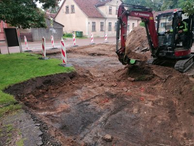 Turpinās darbi pie stāvlaukuma atjaunošanas Pētera ielā 10, pie Smilšu ielas 5. nama, kur pēc ...