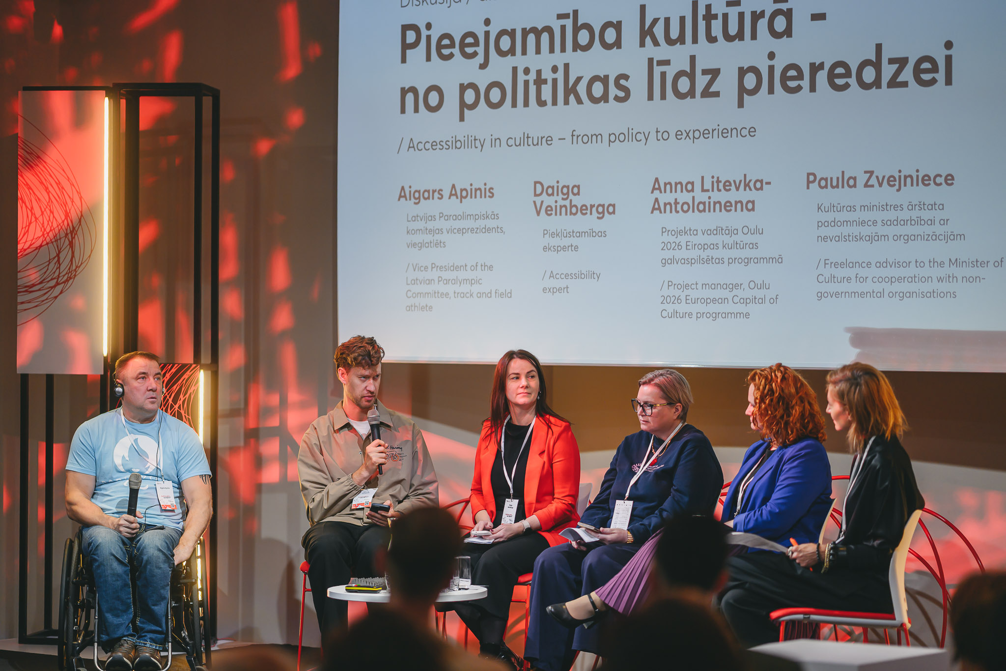 Norisinājās arī diskusija “Pieejamība kultūrā – no politikas līdz pieredzei”, kurā piedalījās Latvijas Paraolimpiskās komitejas viceprezidents, vieglatlēts Aigars Apinis, piekļūstamības eksperte Daiga Veinberga, Oulu 2026 projektu vadītāja Anna Litevka-Antolainena (Anna Litewka-Anttolainen) no Somijas un Kultūras ministres ārštata padomniece sadarbībai ar nevalstiskajām organizācijām Paula Zvejniece.