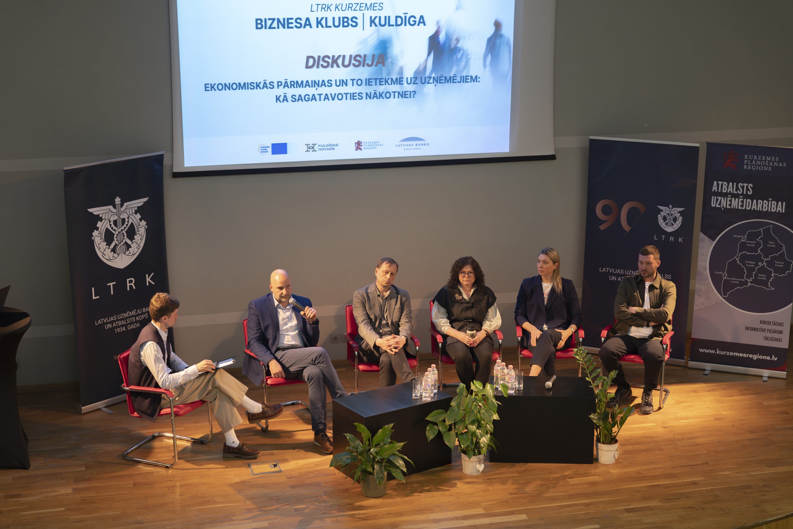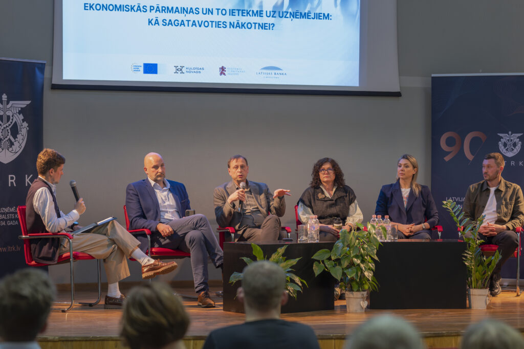 Pasākuma turpinājumā diskusijas “Ekonomiskās pārmaiņas un to ietekme uz uzņēmējiem: Kā sagatavoties nākotnei?” dalībnieki – Ārlietu ministrijas ārējās tirdzniecības un ārējo ekonomisko sakaru veicināšanas departamenta direktors Ģirts Jaunzems, Latvijas Bankas ekonomiste Agnese Puķe, NATO Stratēģiskās komunikācijas izcilības centra Vecākais politikas un pētījumu vadītājs Jānis Karlsbergs, Timberteh valdes loceklis Toms Egle, Starptautisko biznesa pakalpojumu asociācijas “ABSL Latvia” valdes priekšsēdētāja Aļesja Kirčenko – moderatora, LTRK valdes locekļa Jāņa Lielpētera, vadībā aktīvi diskutēja par ekonomikas pārmaiņu ietekmi uz uzņēmējdarbību, sniedzot praktiskus risinājumus un stratēģijas, kas palīdzēs uzņēmējiem pielāgoties mainīgajiem apstākļiem.