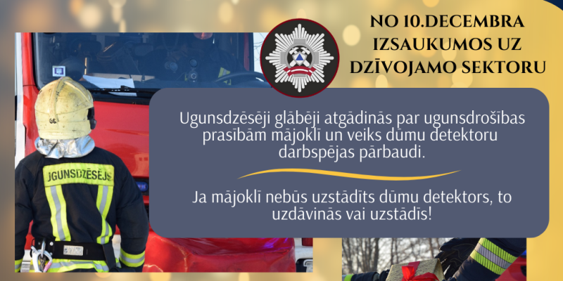 No 10. decembra Valsts ugunsdzēsības un glābšanas dienests (VUGD) īstenos informatīvo kampaņu “Izglāb dzīvību – uzstādi un regulāri pārbaudi dūmu detektoru!”, kuras ietvaros izglītos iedzīvotājus par dūmu detektoru darbības principiem un nepieciešamību regulāri veikt tā darbspējas pārbaudi, kā arī uzstādīs vai dāvinās dūmu detektorus to senioru un ģimeņu ar bērniem mājokļos, kuros būs izcēlies neliels ugunsgrēks.